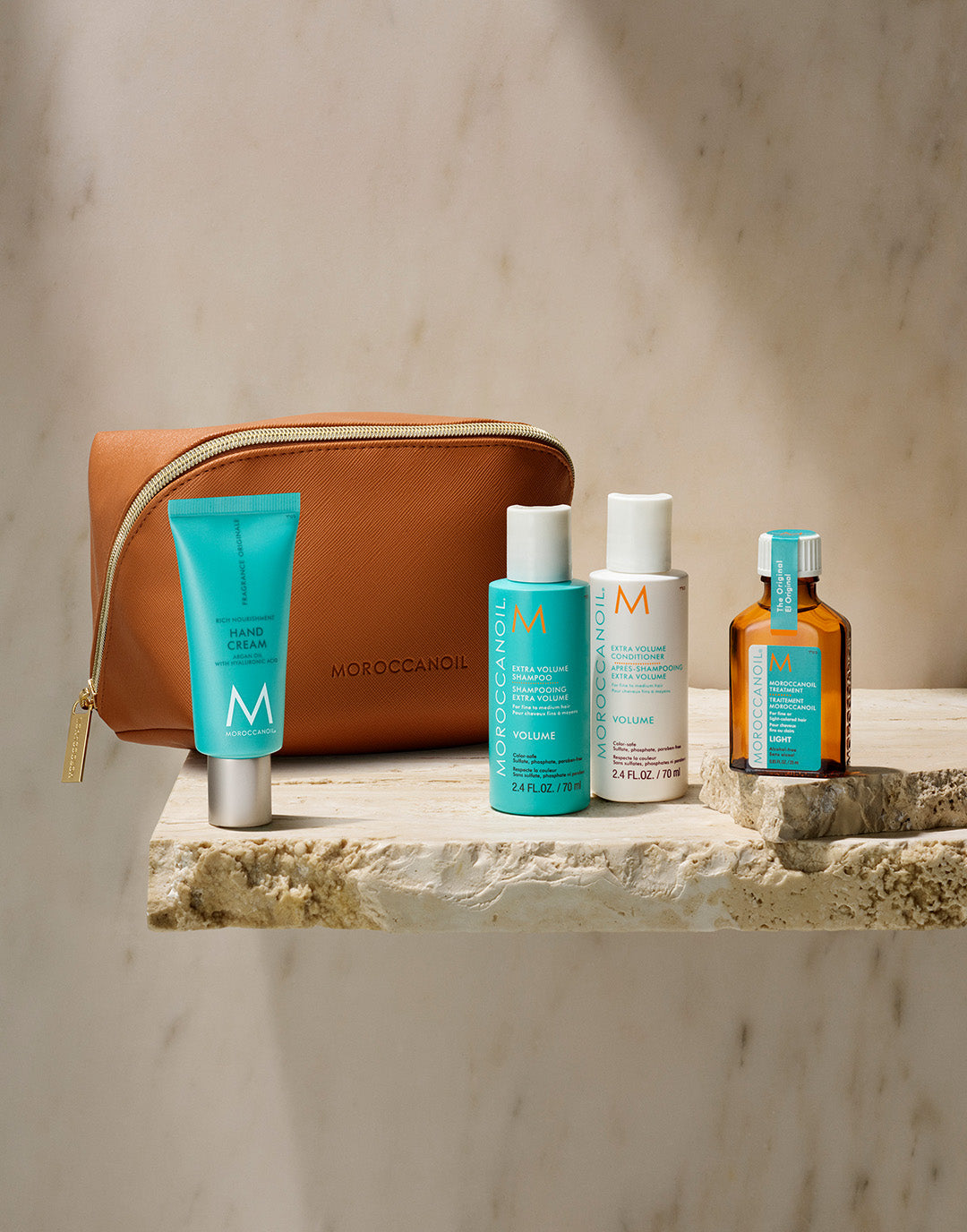 Give fine, flat hair a boost with the Volume Travel Set. All four travel-sized products are formulated with argan oil and other nourishing ingredients and fragranced with our signature scent, a Mediterranean-inspired blend of spicy amber and sweet floral notes. The products come inside a complimentary cosmetic bag that unzips to open fully, providing easy access to your beauty products. It’s water-resistant and soft-sided for packing ease and is made from a blend of recycled materials.